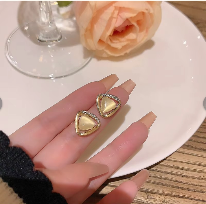 The Cat's Eye Triangle Stud Earrings are the perfect mix of modern design and timeless beauty. Featuring a captivating cat's eye stone set in a sleek triangular stud, these earrings offer a unique twist on the classic stud style. The mesmerizing, iridescent glow of the cat's eye stone catches the light, adding a hint of mystery and sophistication to any outfit.